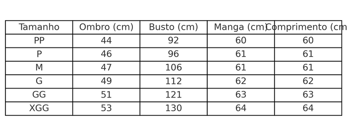 | Tamanho | Ombro (cm) | Busto (cm) | Mangá (cm) | Comprimento (cm) |